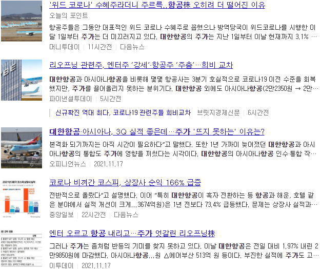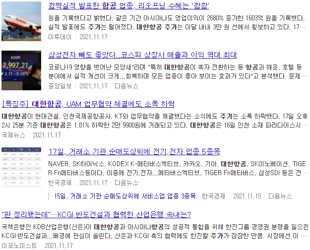 대한항공 주가 언론보도 자료