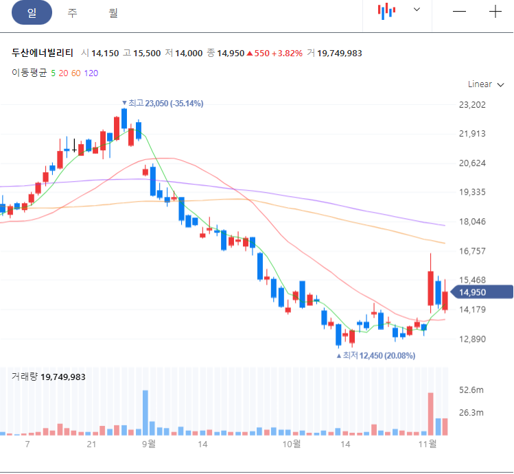 두산에너빌리티(전 두산중공업)은 전 거래일 대비 3.82% 오른 1만 4950에 거래를 마쳤습니다.