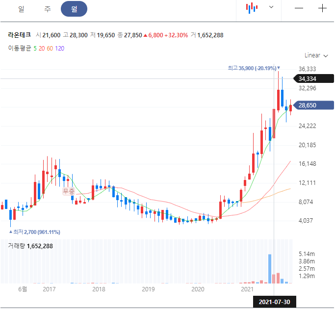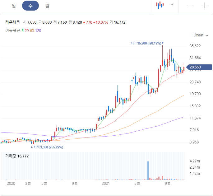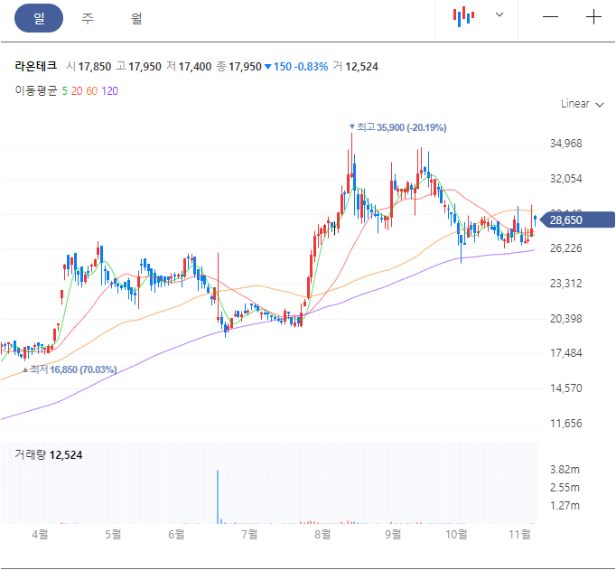 라온테크 현재가, 일봉, 월봉 차트