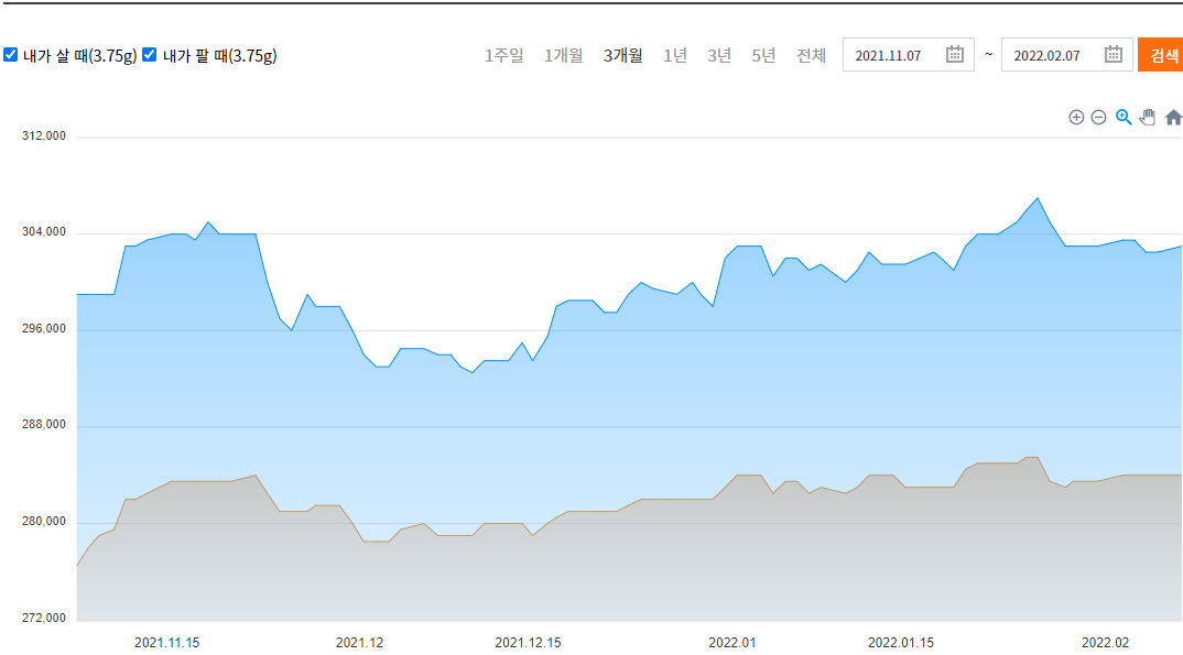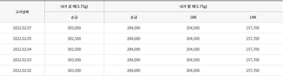 | 순금시세 Gold24k-3.75g | 303,000 0.17% up 500 | 284,000 0% |