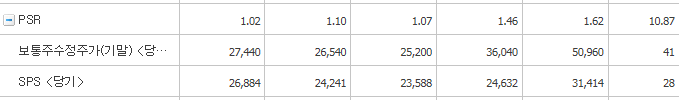 어떤 주식의 가격이 주당 매출액에 비해 높을수록 PSR은 1.0배 이상을 기록하게 됩니다.