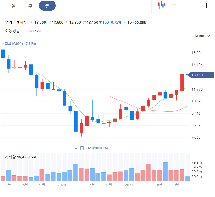 지금 현재 주가가 어느 정도 수준이며, 앞으로 어떻게 진행이 될지, 차트와 수급, 재료 등을 같이 살펴보도록 하겠습니다. 그리고 우리금융지주 목표 주가도 같이 알아보도록 하겠습니다.