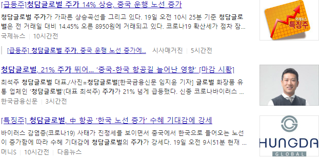 오늘은 글로벌 화장품 유통 업체인 ‘청담글로벌’(대표 최석주) 주가가 21% 넘게 급등했는데 신종 코로나바이러스 감염증(코로나19) 확산세가 진정됨에 따라 중국에서 한국으로 들어오는 항공노선이 증가한 영향으로 풀이됩니다.