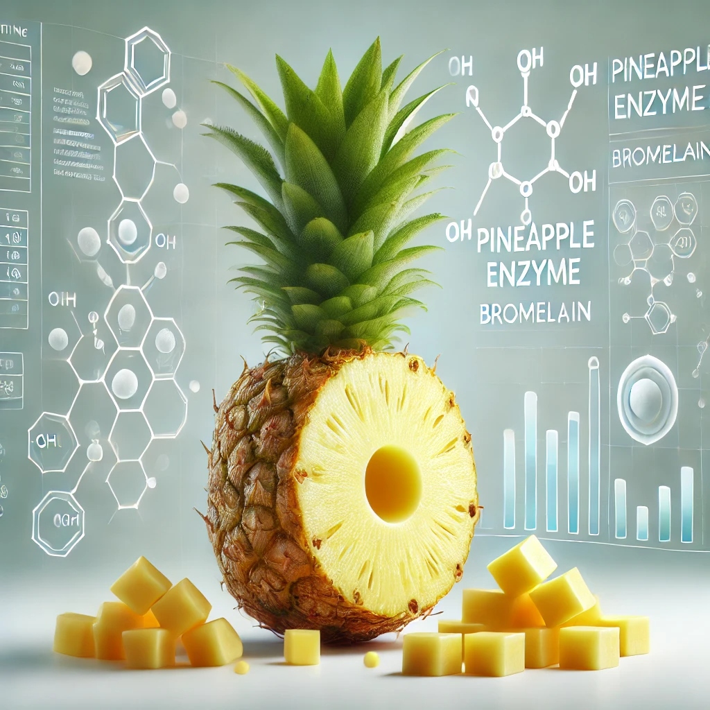 브로멜라인은 파인애플에서 추출한 단백질 분해 효소입니다. 특히 파인애플의 줄기와 중심부에 높은 농도로 포함되어 있습니다. 브로멜라인은 소화 촉진, 염증 완화, 면역력 강화 등 다양한 건강 혜택을 제공합니다. 이 효소는 단백질 분해 능력이 뛰어나, 다양한 소화 장애를 개선하고 신체의 염증 반응을 줄이는 데 효과적입니다. 또한, 항암 작용과 항바이러스 효과도 입증되고 있어, 현대 의학에서도 그 활용 가능성이 높아지고 있습니다.