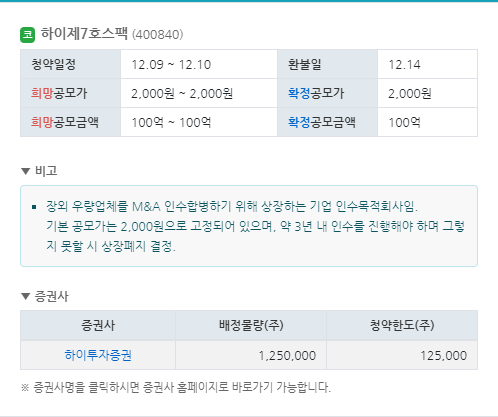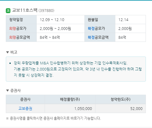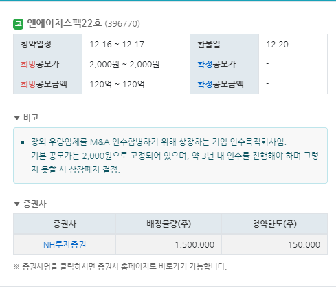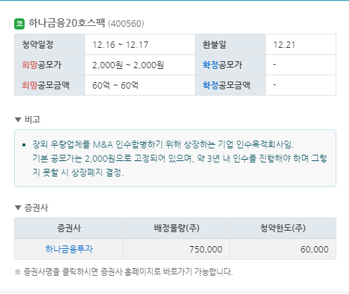 기본 공모가는 2,000원으로 고정되어 있으며, 약 3년 내 인수를 진행해야 하며 그렇지 못할 시 상장폐지 결정.