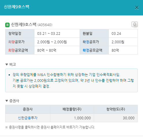 기본 공모가는 2,000원으로 고정되어 있으며, 약 3년 내 인수를 진행해야 하며 그렇지 못할 시 상장폐지 결정.