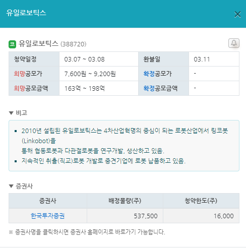 3월 공모주 청약일정 3. 유일로보틱스