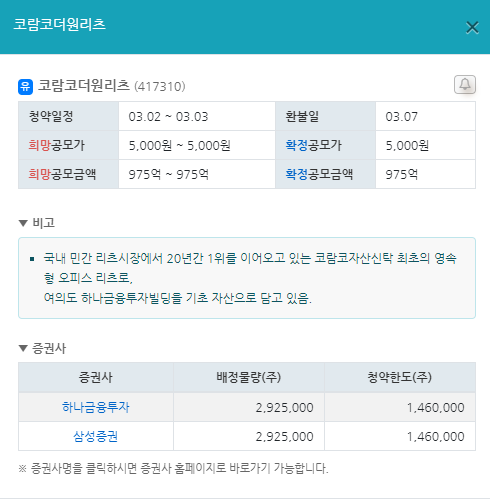 3월 공모주 청약일정 1. 코람코더원리츠