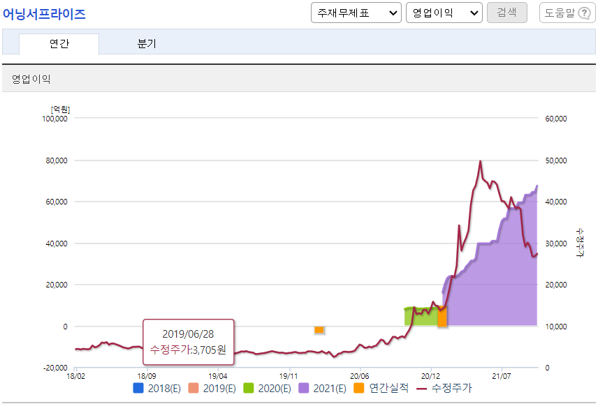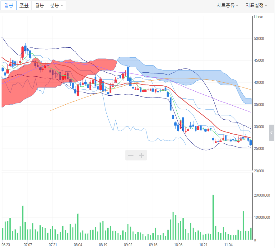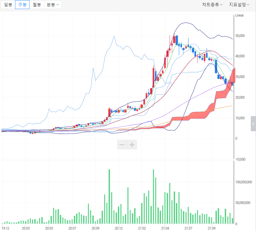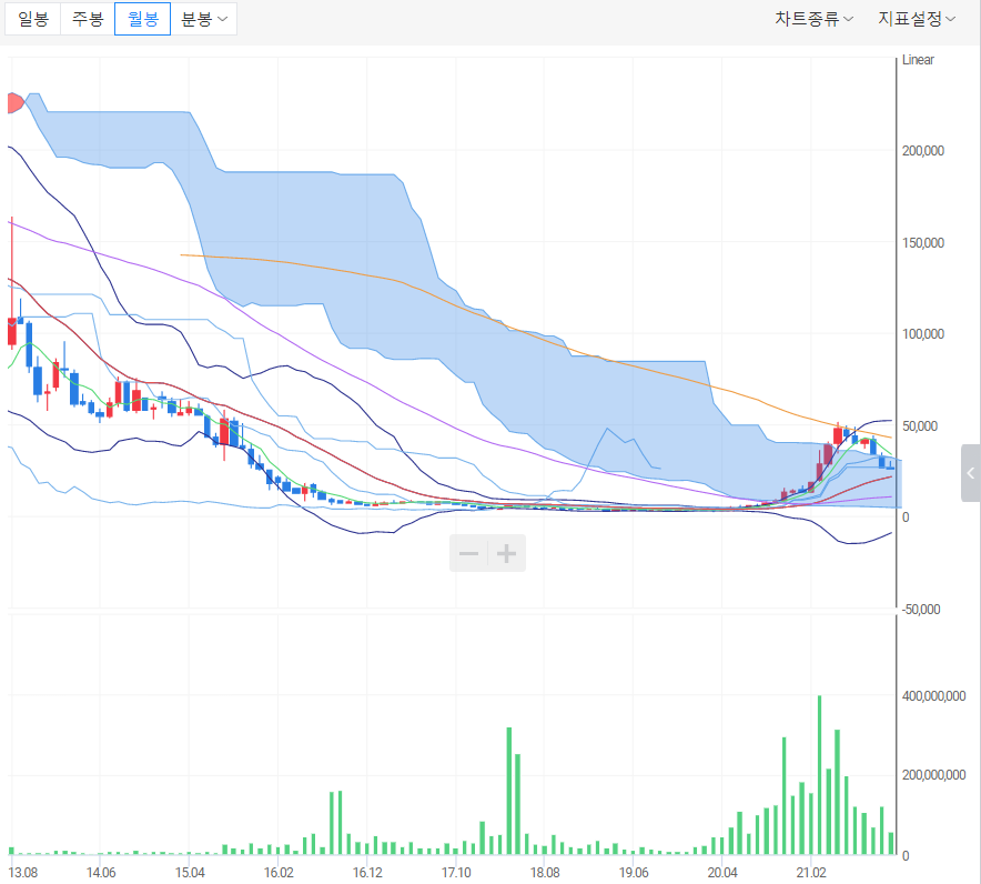 지난해 3월 2000원 초반이던 주가가 지난 5월 말 20배 넘게 급등해 5만원대를 돌파했으나, 10월에 접어들며 2만 원대로 하락해 고점 대비 반 토막