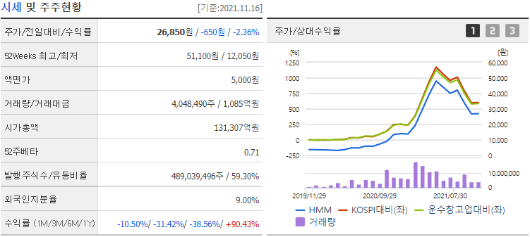 11월 17일 hmm은 전일 대비 3.72% 내린 2만5850원에 장을 마감